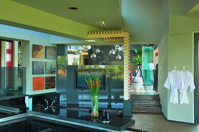 As we heard from the architects, owner requested visually extraordinary house with one very important feature, indoor swimming pool. "The relaxed attitude of the client and the large site (10 000m²/~2.5 acres) provided the architects with a golden opportunity to explore the home three-dimensionally with advanced 3D computer software, and fuse the programmatic requirements into the 3D model. The outcome was a design where form meets function. Enhancing the structure are the incorporation of sun-orientation, circulation, open-plan living areas, view orientation and privacy."